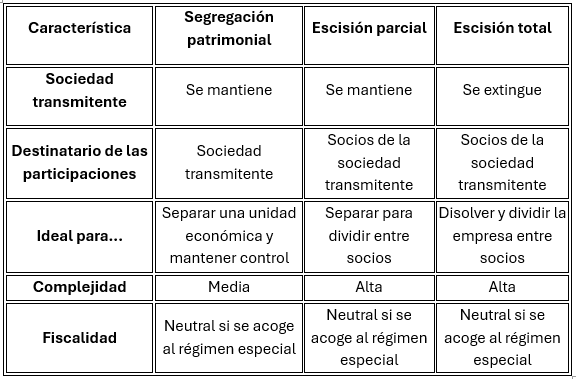En síntesis, la escisión parcial puede ser útil si el objetivo es distribuir el patrimonio entre socios o si los socios desean participar directamente en ambas sociedades. En cambio, la segregación es más adecuada cuando la sociedad originaria quiere mantener el control de los activos segregados, bien por motivos de gestión, fiscales o de estrategia empresarial.